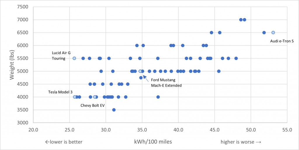 A major obstacle to increased EV efficiency is weight. EVs generally weigh more than comparable internal-combustion models due to their battery packs, and automakers are tempted to increase the size of the pack to increase range. But even when battery pack weight is factored out, some EVs like the Audi E-Tron S are still underperforming on efficiency.