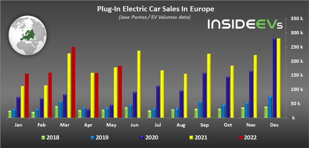 So far this year, some 907,294 new passenger plug-in electric cars were registered in Europe. That’s about 20% of the total volume (down from 21% in the first four months of the year).