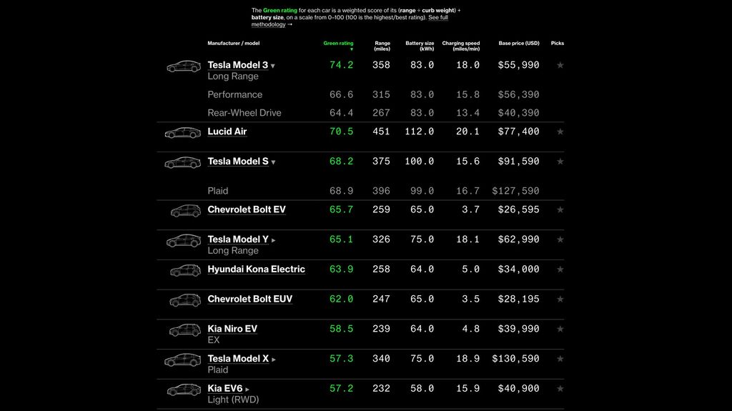 More specifically, the Green rating for each car is a weighted score of its range divided by curb weight plus battery size, on a scale from 0 to 100 (100 being the best rating). The efficiency makes up 70% of the score, while battery size makes up 30%. Here’s how Bloomberg explains the methodology of calculating the scores.