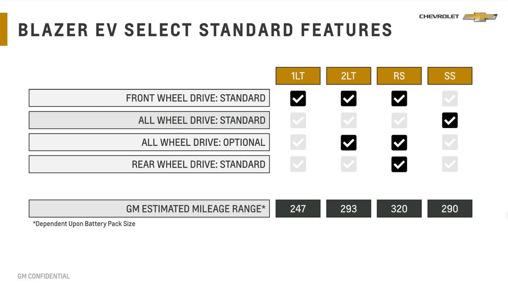 Chevrolet will offer the Blazer EV in several distinct trims with multiple range options, including an available GM-estimated 320 miles (515 kilometers) of range on a full charge and available front-, rear- and all-wheel-drive configurations.
