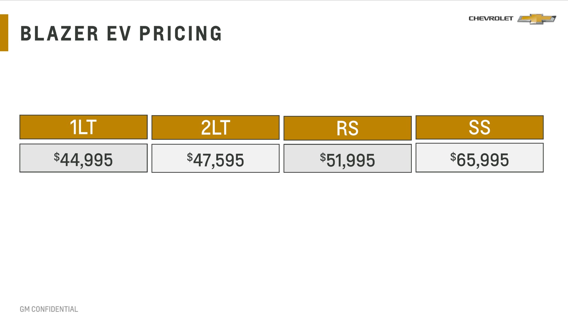 The 2024 Chevrolet Blazer EV 2LT and RS will be the first to go on sale in summer 2023, priced from around $47,595 and $51,995, respectively. The SS will follow later in 2023, priced at around $65,995, followed in Q1 2024 by the 1LT priced from around $44,995 and the PPV fleet model.