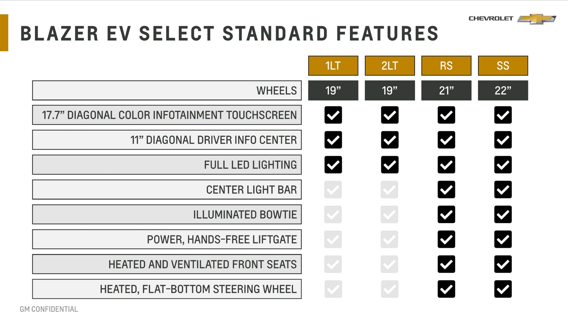 RS and SS trims add a flat-bottom steering wheel, heated and ventilated front seats, and personalization function for the ambient lighting system. The Blazer EV RS also adds blue and red contrasting stitching, while the SS features sueded microfiber seating, Adrenaline Red seating surfaces and heated rear outboard seating positions (optional on RS).