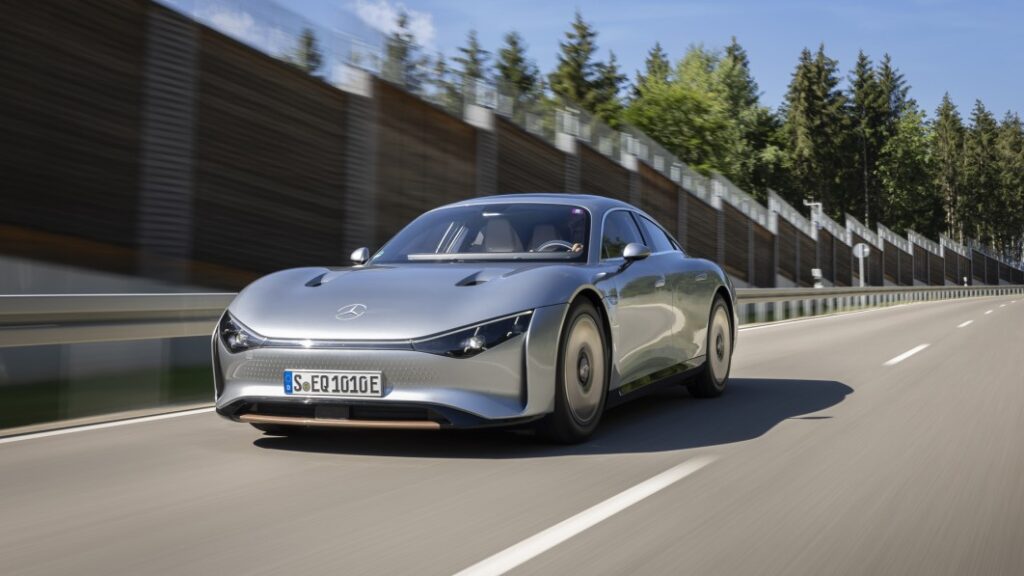 Solar panels integrated into the roof help channel electricity to the battery pack. They add weight, but the tradeoff was worth it. When the EQXX covered the 747 miles separating Stuttgart and Silverstone, England, the 117-cell solar setup contributed approximately 26 miles of driving range.