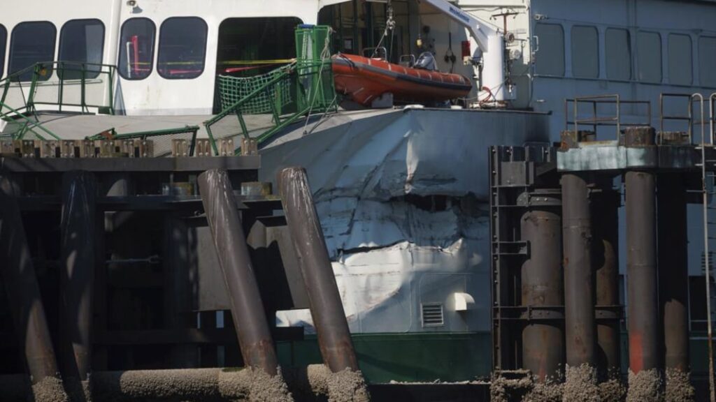 The Seattle Times reports the left top part of the vessel was crumpled. The boat was docked and by 9 a.m., the last vehicles had been brought off the boat.