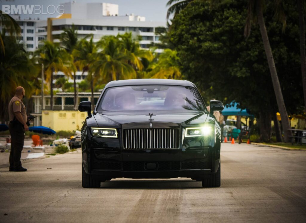 The Roller in question is a Rolls-Royce Ghost Black Badge in a black paint so thick it weighs 40 kilos. Being a Black Badge model, its Spirit of Ecstasy is black, its trim is black, its grille is black, and even its wheels are mostly black. Everything is black. Inside, it has black leather, black carbon fiber trim, and even black champagne flutes. There really isn’t any other color used in the car. There’s a touch of red in the digital speedometer but that’s about it.