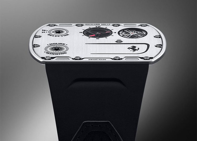 While a newly designed twin-turbocharged V6 drives the Ferrari 296 GT3, the RM UP-01 Ferrari generates its power from a newly engineered in-house RMUP-01 manual-winding movement. The complex caliber from Richard Mille accurately powers its hours, minutes, seconds, and selector functions. The titanium-covered back case includes commemorative engravings that signify the special 150-piece release from Richard Mille x Ferrari. Keeping its theme lightweight and minimal, Richard Mille fits the new Ferrari-inspired timepiece with a thin black rubber strap.