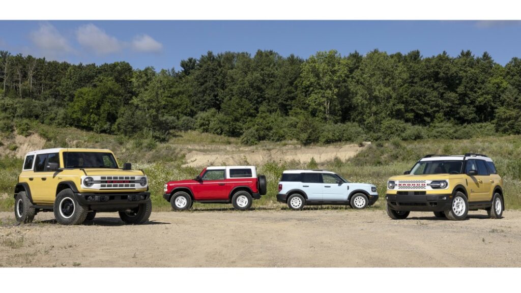 “Bronco Heritage Edition is available in five paint options, while Bronco Heritage Limited Edition is exclusively available at launch in Robin’s Egg Blue, which is a throwback color based on Arcadian Blue, available on the original Bronco in 1966,” Ford says. “The color Yellowstone Metallic, which is based on the 1971 Ford color Prairie Yellow, is planned for late 2023 model year availability. Peak Blue is planned for the 2024 model year.”