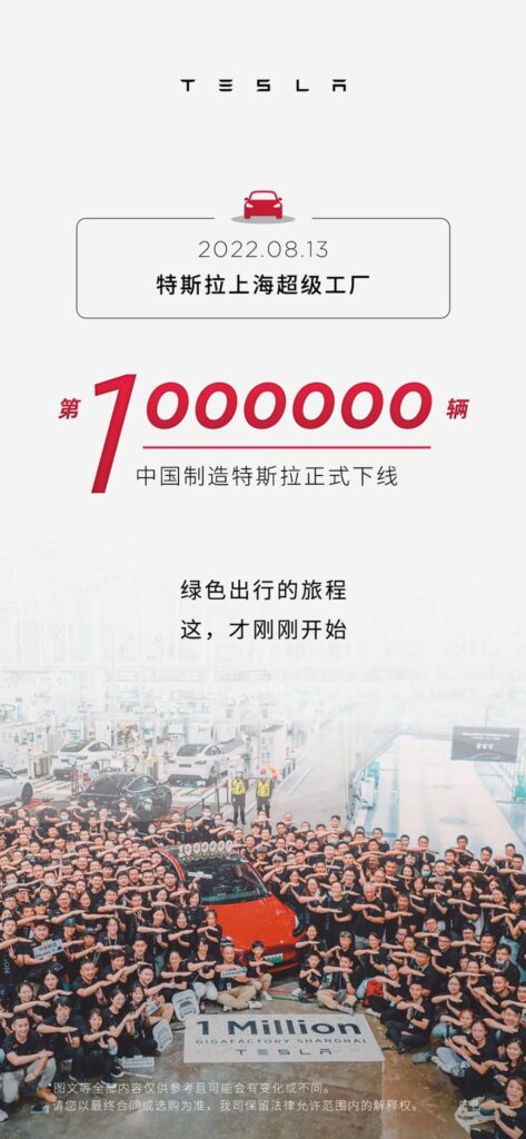 Tesla celebrates the 1 millionth electric car produced at the Tesla Giga Shanghai plant in China. The official confirmation indicates that the jubilee EV was produced on August 13, 2022.