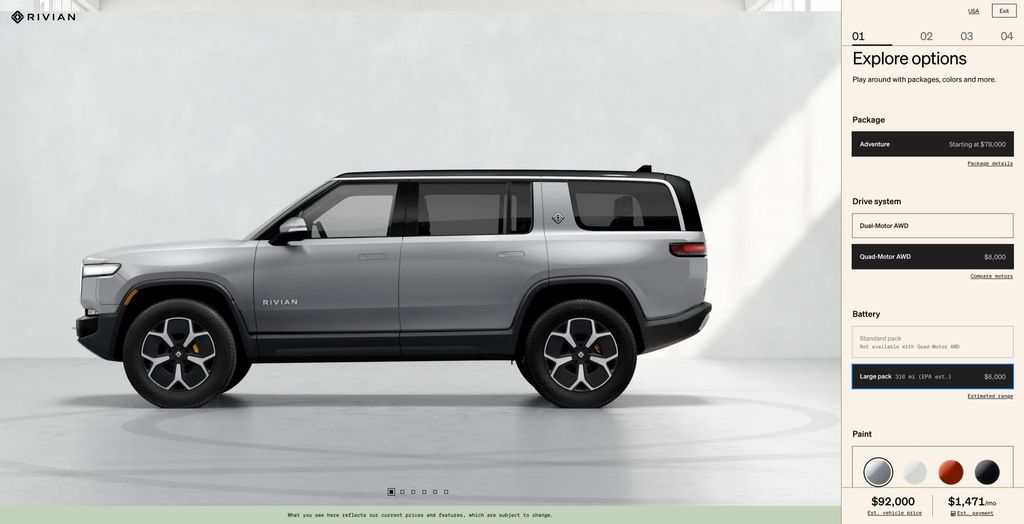 The Rivian configurator lists the R1T Adventure quad-motor with the Large battery pack at $87,000; a similarly configured R1T Explore used to cost $79,500. The same goes for the R1S Adventure quad-motor with the Large pack, which is priced from $92,000, whereas the equivalent Explore model used to start at $84,500.