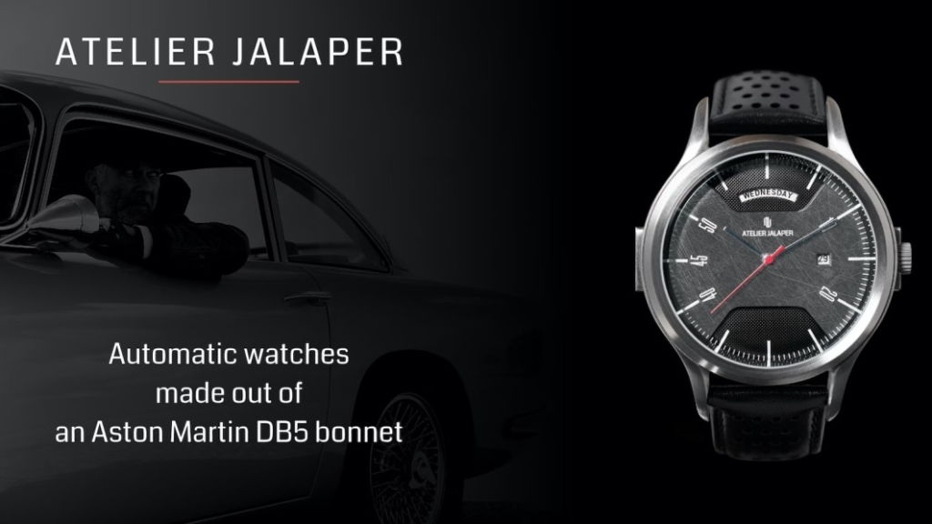 There are more than a few famous movie cars, like Eleanor, Doc’s DMC-12, the Bandit’s Trans-Am, and Bullitt’s Mustang, for instance. There are hardly any movie cars that are famous, beautiful, and lustworthy, and that 60 years later are still having a moment. Consider that Aston Martin produced the DB5 from 1963 to 1965, sending only a touch more than 1,020 units into the world, but it seems like every six months we get a new take on either the car itself or something having to do with the car. Atelier Jalaper is the latest to make an entry in the latter category. Two gents got the idea to produce a watch using something from a historic car. After putting the Jaguar E-Type, AC Cobra, Ferrari F40, and Aston Martin DB5 donor cars up for vote on Instagram, the people chose Bond, and the results are the AJ-001 and AJ-002 watches.