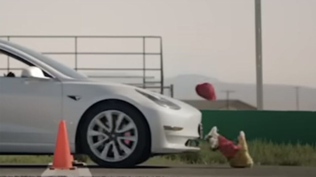 One of the videos posted by the group shows a Tesla vehicle with FSD software running over child-sized mannequins, and says “Tell Congress to Shut it Down.”