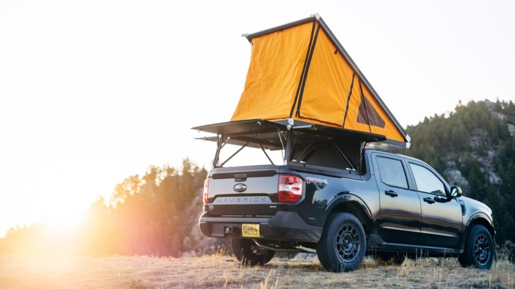 Above that sits the slim hardshell around the wedge tent. Closed, the structure is said to add 6.5 inches to the Maverick’s height above the sharkfin antenna. That’s about two inches taller than a four-door Ford Bronco with the soft top, about the same height as a base Ford F-150 XL, and about three inches lower than a Bronco with the hardtop and a roof rack. When opened, the wedge tent makes a 7.5-foot-tall roof at its highest point above the truck bed. For those who don’t mind standing or carrying a collapsible stool, the adjustable tent floor can make a desk. Inside the tent, a the two-layer foam mattress makes a 90-inch by 50-inch sleeping surface. Above, the translucent honeycomb roof lets in diffuse light and provides a measure of insulation.
