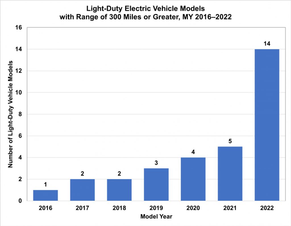 The first model with an EPA range of 300 miles (483 km) of driving range entered the market several years ago, as a 2016 model year. Since then, a few more BEVs with 300+ miles of range were launched, while in the 2022 model year, we can see a real surge to 14 models.