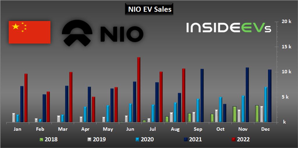 NIO reports that its overall electric vehicle delivers in August increased by 82% year-over-year to 10,677, which is also a slight improvement over July.