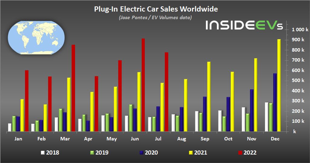 According to EV-Volumes data, shared by Jose Pontes, some 778,092 new passenger plug-in electric cars were registered in July, which is 61% more than a year ago.
