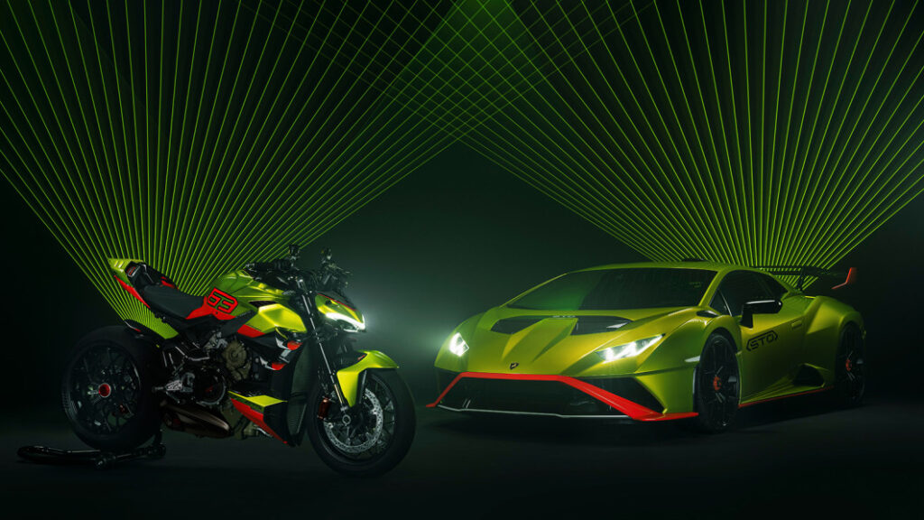 For the latest tie-up, Ducati says it applied its well-known “Fight Formula” to the existing Panigale V4 S (the latest Streetfighter makes 208 horsepower and 90 pound feet of torque) and then took it a step further, integrating styling elements that are “unmistakably Lamborghini.” Depending on which generation of Lamborghini you grew up with, that could mean just about anything. Remember the ’80s? Like, all of them? But in this case, Ducati and Lamborghini settled on a mix of modern styling and heritage inspiration.