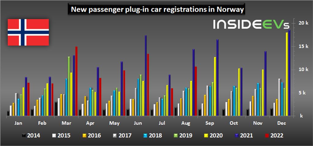 New passenger car sales in Norway continue to decrease. In August, the number of registrations amounted to 12,363 (down almost 25% year-over-year). That brought the year-to-date number to 88,115 (down 20.5%).