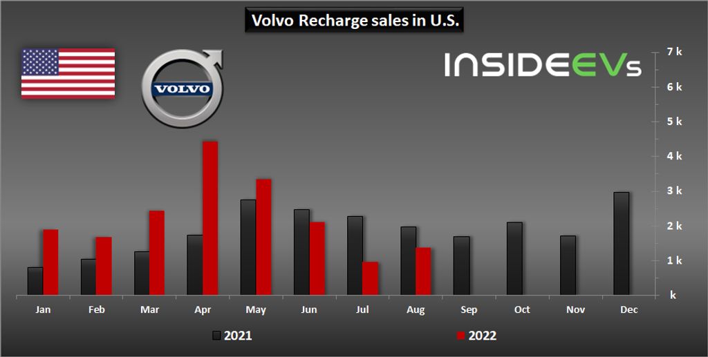 Last month, a total of 1,380 plugs-in were sold, which is 30% less than a year ago (after a 58% decrease in July). Volvo Recharge models stand for 17% of the total Volvo volume.