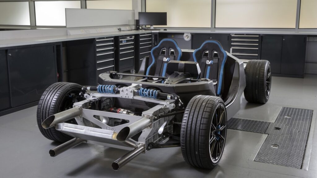 The list of in-house innovations on the EVR chassis includes a Scalable Battery Module that opens up flexibility for custom packs and sub-pack systems, controlled by battery management software that rationalizes the amount of electronics needed to run the powertrain. The company says each module has a capacity of 1.08 kWh at 50 volts maximum or 43 volts nominal, and an energy density greater than 240 Wh/kg. The individual cells are wrapped in carbon fiber, too, claimed to improve crash resistance. Battery cooling is run through the energy-absorbing side sills.