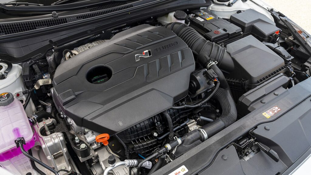 Here’s a fun fact about these cars: not only does the Elantra N deliver virtually identical performance to the Veloster N while being bigger, it’s also more efficient. Between manual models, the combined fuel economy is the same at 25 mpg, but the Elantra’s 31 mpg on the highway is 3 mpg better than the Veloster. The automatic Elantra gets 23 mpg combined, an improvement of 1 mpg over the Veloster, and the 30 mpg highway figure is another 3 mpg increase (the auto-only Kona N gets basically the same fuel economy as the Veloster). Since both cars have identical gear ratios, the difference is likely the Elantra’s more aerodynamic shape.