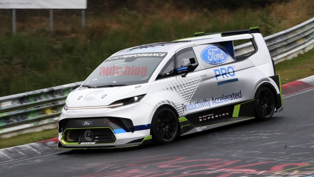 It doesn’t look like much has changed since the SuperVan made a splash at the Goodwood Festival of Speed. The van giving it all on the ‘Ring is tall, wide, low, and fitted with a body kit you’d expect to find on a race car. It needs the downforce: It’s powered by four electric motors (one per wheel) that draw electricity from a 50-kilowatt-hour lithium-ion battery pack to make Rimac Nevera-rivaling power. Ford quotes the SuperVan’s 0-to-60-mph time at under 2 seconds, which sounds like every Amazon delivery driver’s dream come true.