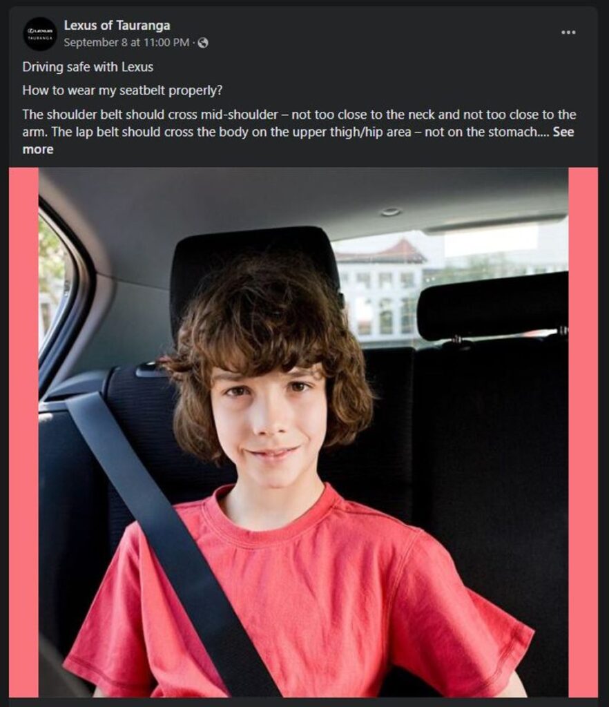 Lexus of Tauranga has been running an ad campaign that’s centered around safety. If you visit the dealership’s Facebook page now, you may see a post at the top of the page from September 8, 2022. It shows a child and addresses proper seatbelt positioning. Similarly, the previous image of the Model 3 was related to steering wheel positioning.