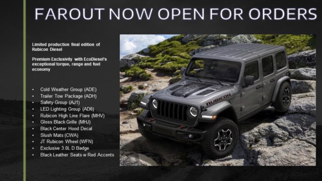 Ram pulled the EcoDiesel from the 1500 lineup for 2023, the pickup losing its oil-burning option as soon as January. According to a post at the JL Wrangler Forums, the Jeep Wrangler is the next in the Stellantis family to lose the VM Motori mill, but the news has only been revealed to Jeep dealers for the moment. An e-mail reportedly sent to Jeep dealers detailed a “Limited production final edition of Rubicon Diesel” with “Premium exclusivity.” The digital card didn’t give away numbers, but the Wrangler EcoDiesel is already low on the demand chart, so we’d not be surprised at a cap in the hundreds.