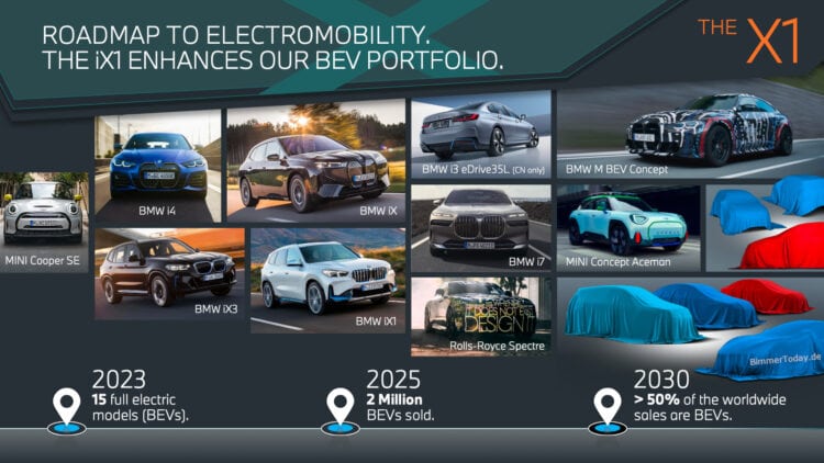 The peeps from Munich might have provided an early sign of their first “real M” with no combustion engine during a meeting with members of the media. As part of the official presentation of the new X1, BMW had a slideshow illustrating its roadmap to electromobility. We get to see all the models on sale today that are mentioned above, along with the M BEV Concept and several vehicles hiding under covers.