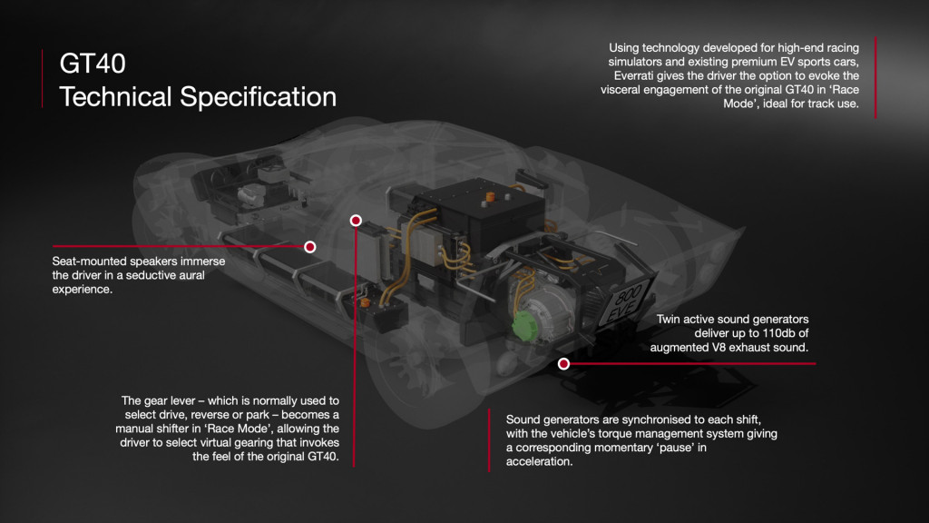 For example, the GT40 conversion features a gear shifter that in Race mode enables the driver to select “virtual” gears, where each shift is synchronized to sound generators and torque delivery to give the effect of actual gears being shifted. There’s even a momentary pause in power deliver to simulate the feel of the driver lifting off the pedal.