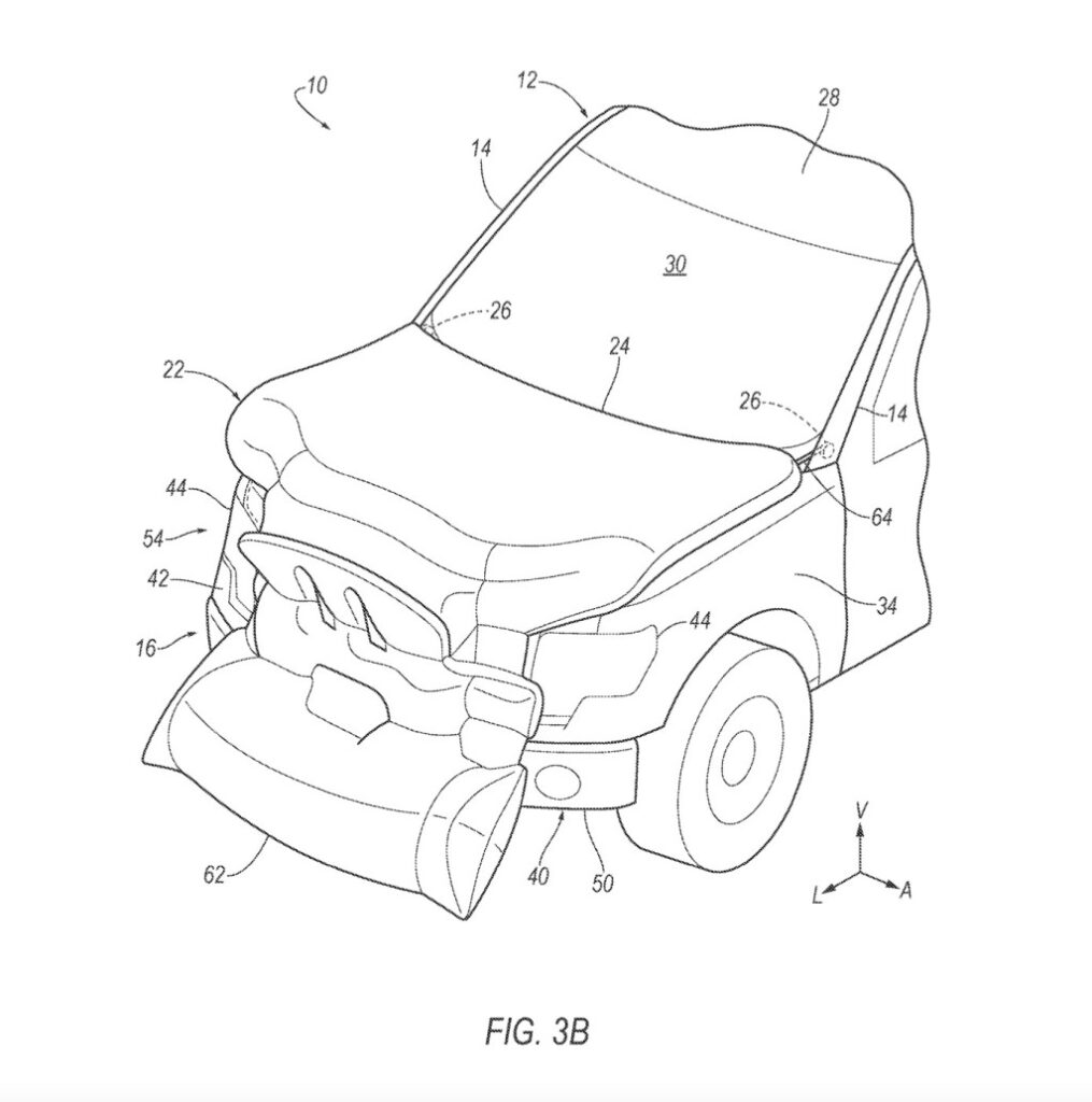 Ford has filed a patent application for an external airbag that would deploy from behind a vehicle’s grille during collisions.
