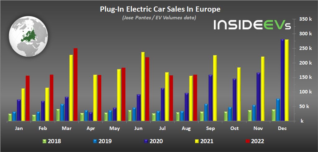According to EV Volumes data, shared by Jose Pontes, over 159,000 new passenger plug-in cars were registered in Europe in August, which is 2% more than a year ago. The market share amounted to 21%.