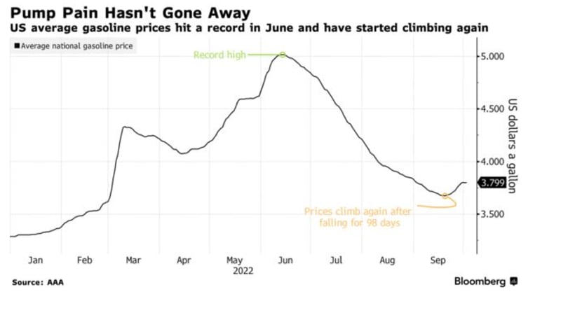 In California, home to the costliest gasoline in the U.S., prices are nearing their June peak again, and the increase is spilling over into neighboring states. The election battleground of Nevada has the most expensive gasoline after California, and other key states like Michigan and Arizona are paying prices above the national average of $3.799 a gallon, according to data from auto club AAA.