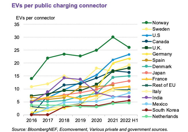 EVs per public charging connector, by country – Bloomberg New Energy Finance