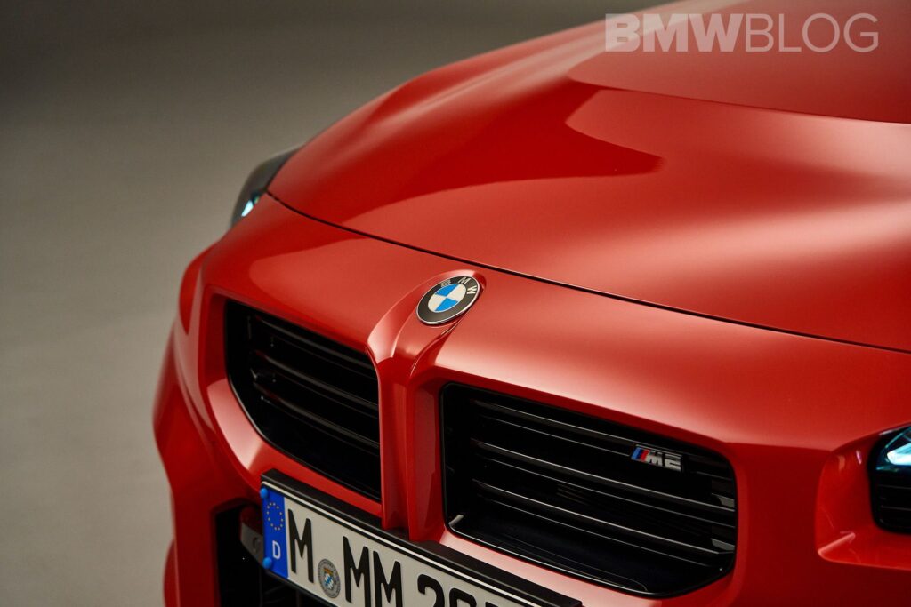 BMW is eager to show the new M2 decked out with the full array of M Performance Parts for an even more aggressive look. Shown here in M Toronto Red, the sports coupe has a meaner front end with a carbon fiber spoiler lip extending onto the sides of the bumper courtesy of chunky end plates. The square intakes seem to stick out more than they do on the standard G87 and you’ll also notice the 50 years of M anniversary emblems.