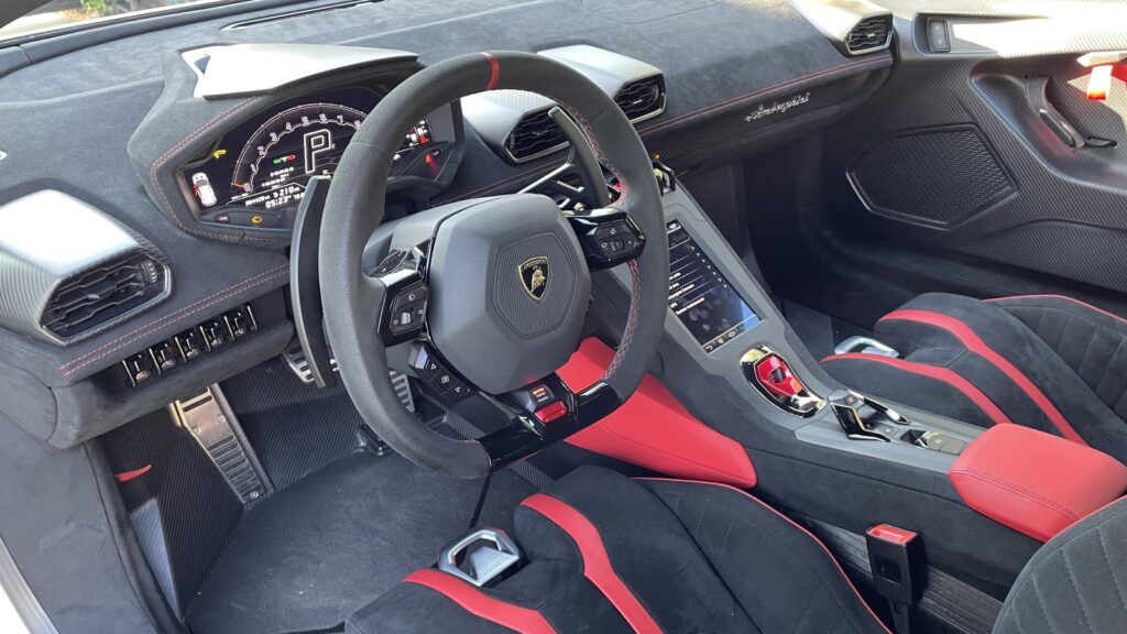Flipping up the cover for the start/stop button is normal Lamborghini, but that doesn’t make it any less dramatic. The V10, which is shared with the regular Huracan EVO and Super Trofeo, barks to life with even more anger than anybody could hope for — it’s jump-scare worthy for anybody standing near the exhaust outlet. Despite the STO having a pretty normal infotainment system (apart from the frustratingly missing volume knob), Lamborghini puts the backup camera in the cluster, where it’s actually quite useful and ergonomic. Add a quick-operating nose lift for that carbon-fiber nose and easily used side mirrors, and navigating in or out of parking spots in this beast isn’t as arduous as it could be.