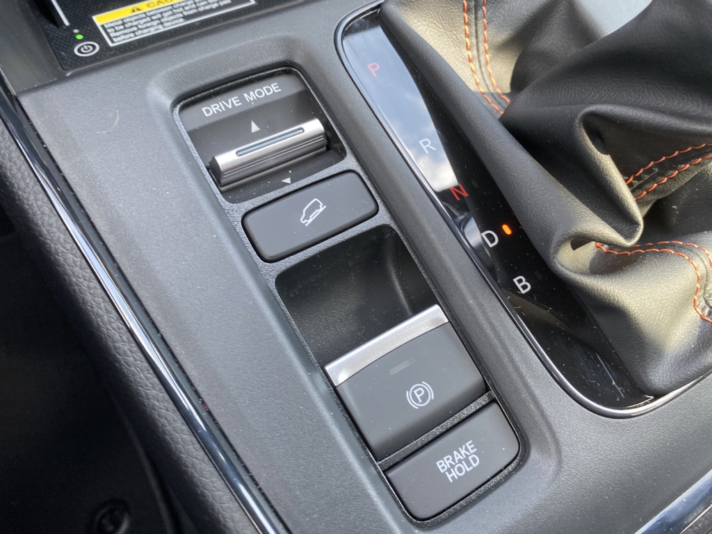Honda offers four levels of brake regen. Selecting D is designed to feel like a non-hybrid, with very gradual deceleration, while pulling the shifter back to B instantly takes you to the third level of regen (my preference). You can toggle through them all at any point with steering-wheel paddles. Separately, there’s also now Hill Descent Control, allowing predictable control on inclines of 7% or more, at 2-12 mph, and an auto-hold button gives you the option for what happens after you come to a stop.