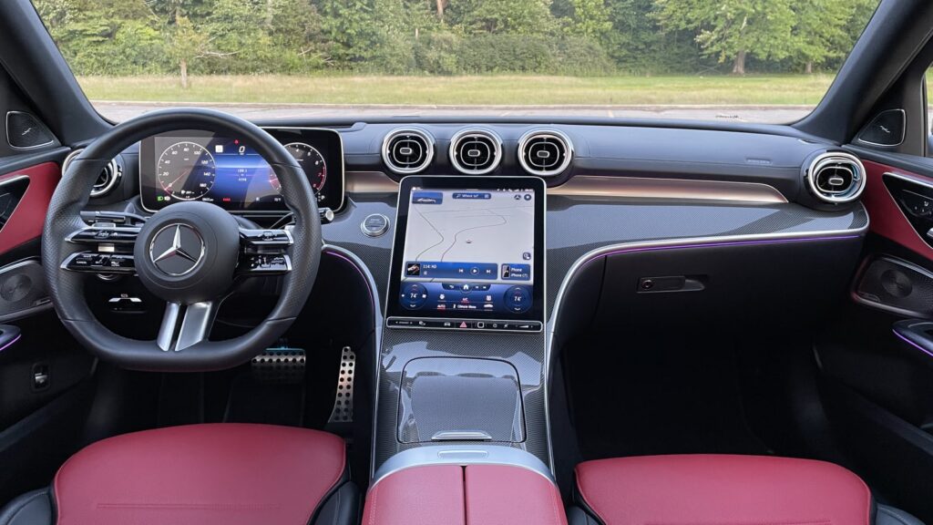 The C-Class borrows heavily (to its advantage) from the recently redesigned S-Class. Generously bolstered seats integrate pivoting headrests on single posts, with a range of interior colors and treatments — a racy red-and-black combo, or brick-like AMG Sienna Brown with natural wood pinstriped with real aluminum. Ambient lighting decorates the doors, dash and aircraft-inspired metal vents with a choice of 64 colors. Architects would dig the cantilevered armrests and “floating,” light-rimmed door-control housings. A three-spoke steering wheel looks as good as it feels, as do bright-metal paddle shifters as cool and polished as river stones.