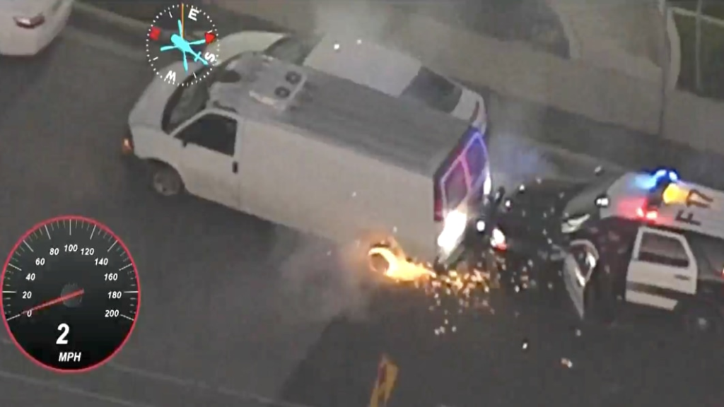 Police say the chase started around 5 pm when they received reports of a person driving erratically and speeding in Anaheim. Officers gave chase, and eventually, the driver ditched the car and stole a van. The pursuit spilled out into street traffic, but not before the driver smashed the van and ran into a police cruiser.