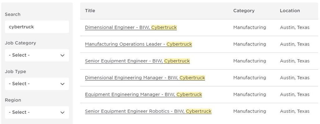 To be clear, we’re not talking about jobs that would be or could be related to the Cybertruck, but rather, jobs that specifically mention the “Cybertruck” name in the job title itself. Have a look: