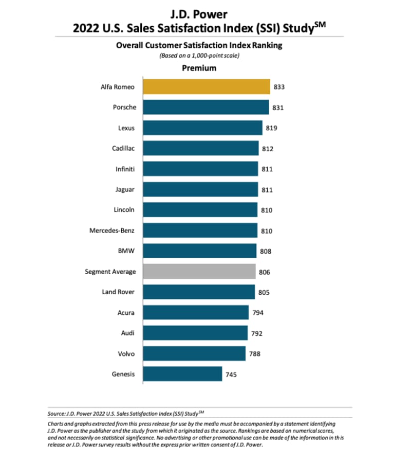 There are positives to the Power conclusions, however, especially for Alfa Romeo dealers. The Italian brand ranked highest in customer satisfaction among premium brands with a score of 833, with Porsche a very close second (831) and Lexus (819) third. Alfa is on something of a roll these days, with its compact Tonale crossover due for release in the spring, and a new sports car in the works.