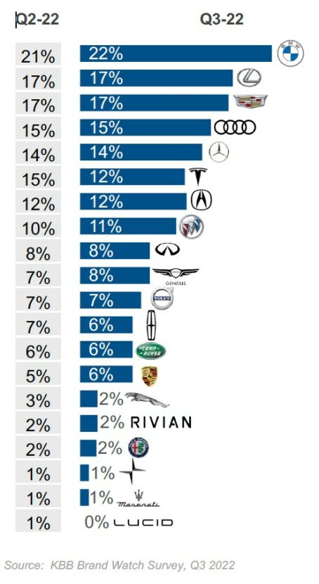 In Q3 2022, Tesla fell from fifth to sixth place as only 12% of luxury car shoppers considered a model from the company, representing a decline of 3%. That’s the biggest drop among all brands from one quarter to the next. In addition, the Model Y is no longer included in the top 10 most-shopped luxury vehicles for the first time in two years while shopping consideration for the Model 3 diminished by 10% compared to Q2 2022.