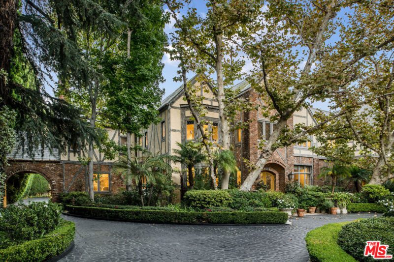 The exceptionally private Tudor-style residence situated on a street-to-street lot of approximately 1.15 flat acres with three gated entries is surrounded by magnificent gardens, a lighted north-south tennis court, separate guest house, a grotto pool and spa, koi pond, fountains and an enormous lawn suitable for lavish gatherings as well as tranquil relaxation.