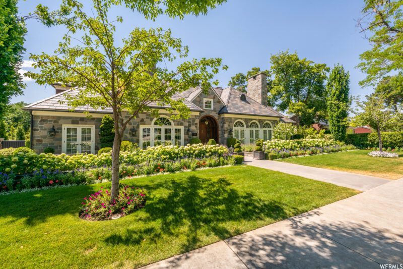 English country charm radiates from this exquisite stone residence nestled on a tree-lined street in the Salt Lake Country Club neighborhood. An island of grass in front serves as a delightful park and at once a mountain view corridor. Elegant Palladian windows in triple form highlight the faade with grand, rich wood entry doors and chiseled slate roof shingles as enhancements. Stunning hydrangeas line the front garden court. A magnificent storybook setting.