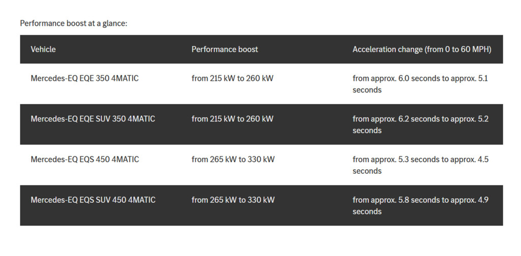 The subscription costs $1,200 annually and is currently available for the EQE, EQE SUV, EQS, and EQS SUV. In each case, 0-60 mph acceleration is improved by around 0.8-0.9 seconds.