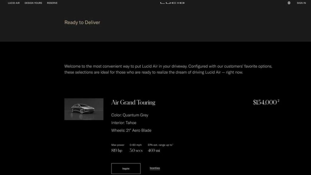 Lucid Group has added a “Ready to Deliver” section on its website for US customers who don’t want to place a custom order and then wait weeks or months for their Air luxury EV to be delivered.