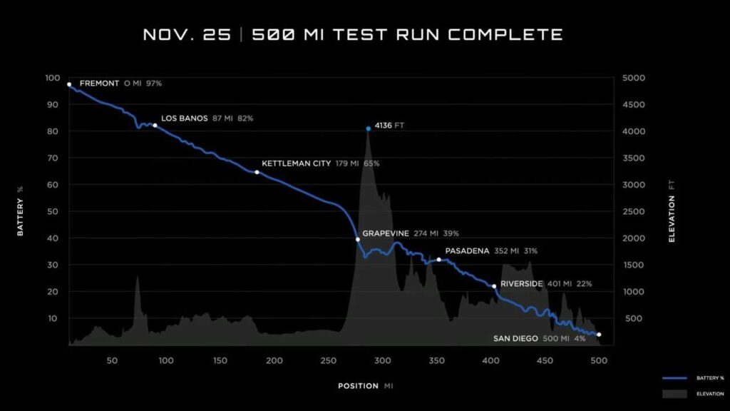 According to the company’s graph, the Semi started at 97% state-of-charge (SOC) and covered 500 miles with 4% SOC left. That’s 93 percent points, which would indicate that the theoretical range during the test (100-0% SOC) would be 537.6 miles (865 km).