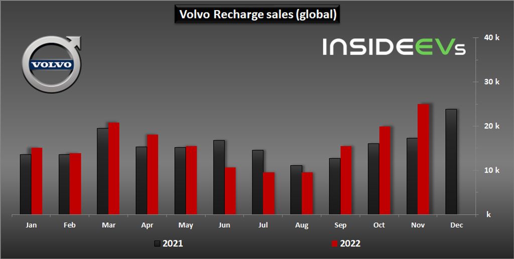 In the case of plug-in electric car sales, Volvo set a new monthly record. In November, almost 25,000 Volvo Recharge cars were sold (up 44% year-over-year). That’s over 42% of the total volume – also a new record share.