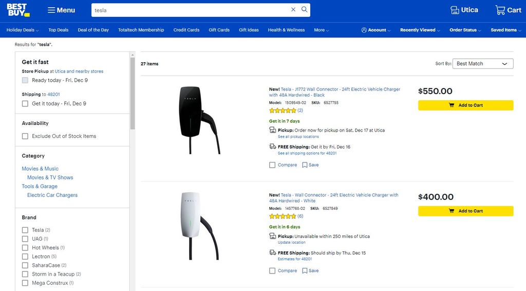 Upon visiting Best Buy’s official website, the Wall Connectors were available for order. The white unit retails for $400, and the new black J1772 unit for non-Tesla EVs costs $550. Shipping and delivery times will obviously vary geographically, but at our local store, you can have either unit shipped and get it in about a week. In-store pickup takes a bit longer, and for the white Wall Connector, the option isn’t available within 250 miles of the Detroit area.