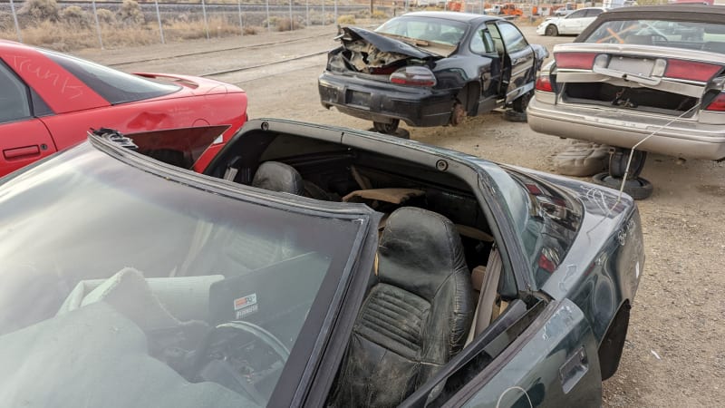 The Chevrolet Corvette is not the kind of vehicle that shows up frequently in ordinary car graveyards; when one wrecks or gets used up beyond restoration, it tends to end up in a specialty yard instead of your typical Ewe Pullet-type operation. Two or three decades back, I’d find the occasional C3 Corvette during my junkyard travels (and I still do, but only nearly unrecognizable shells that I don’t bother to document), but the early C4 is the most likely discarded Corvette to appear in your neighborhood boneyard these days. Here’s an unusual-for-the-junkyard late C4, found recently in a self-service yard in Reno, Nevada.