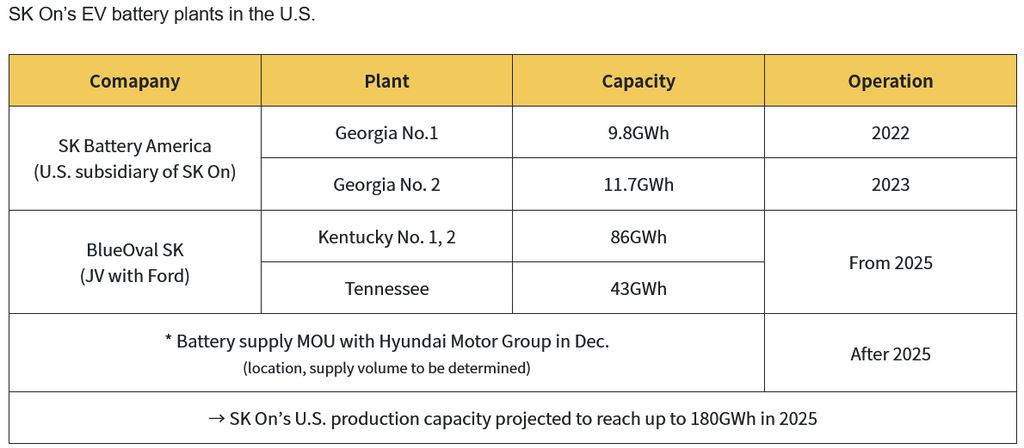 The new joint venture is also important for SK On’s expansion in the US, which is expected to translate into a combined output of up to 180 GWh of EV batteries annually in 2025.